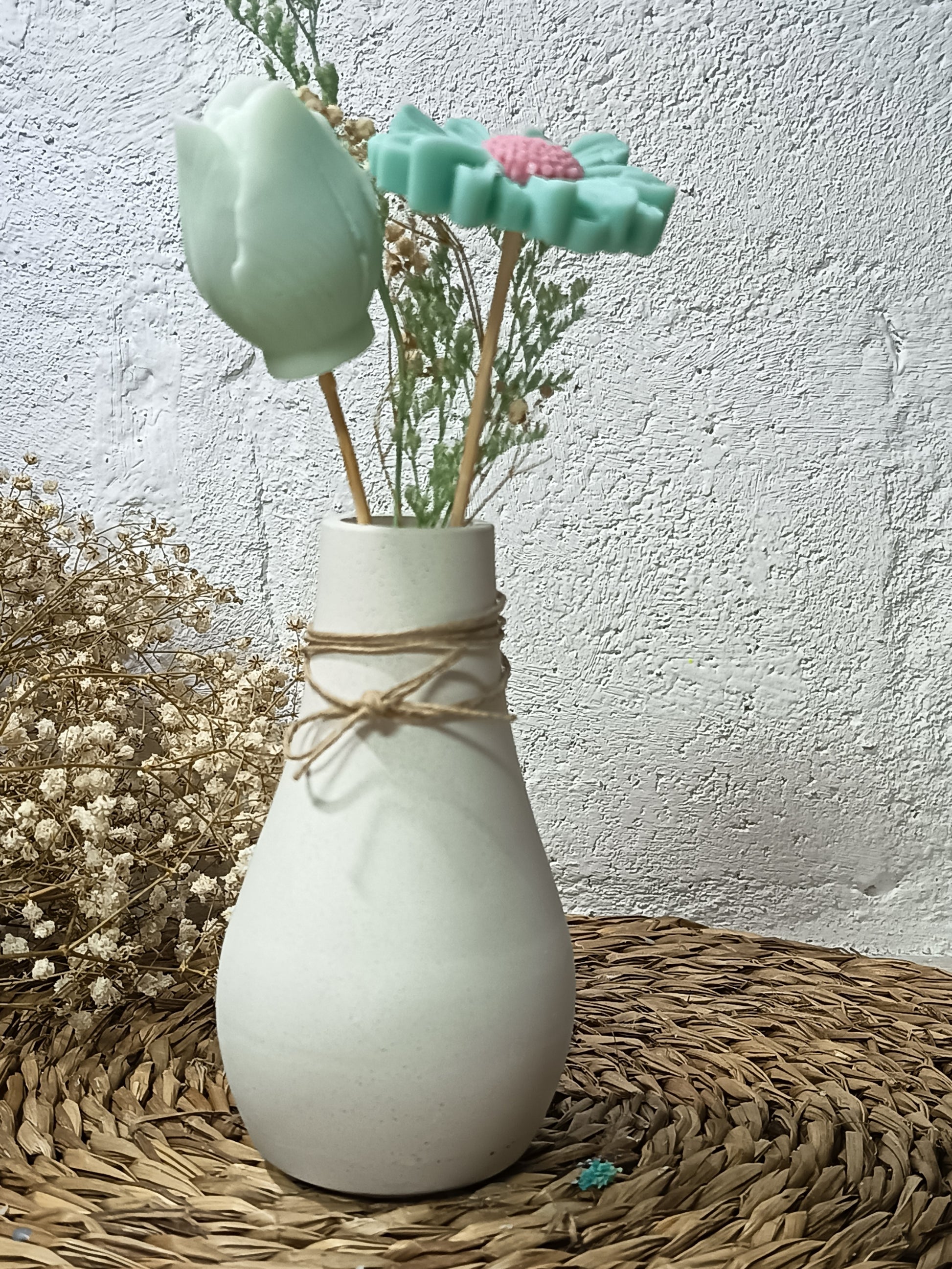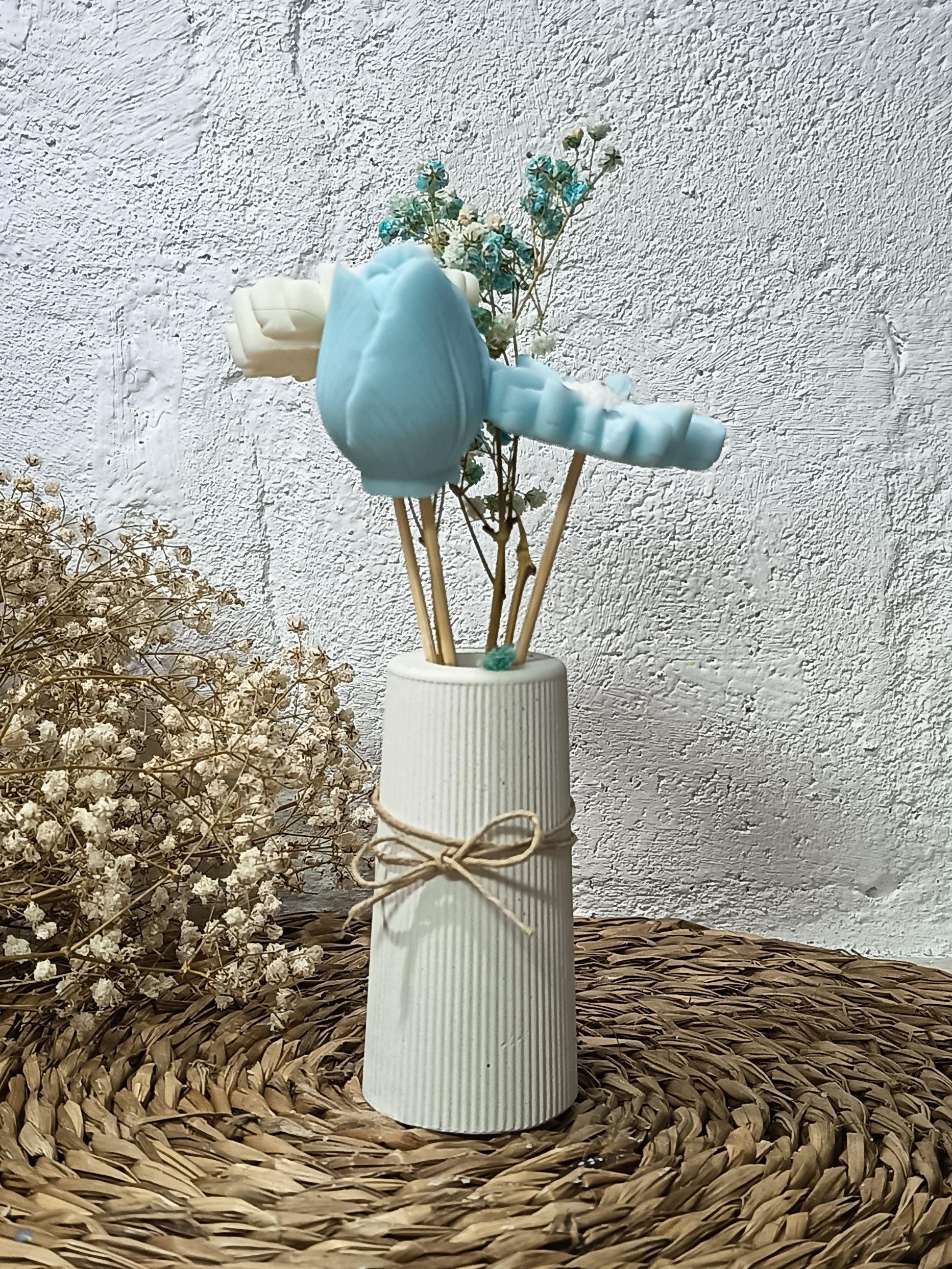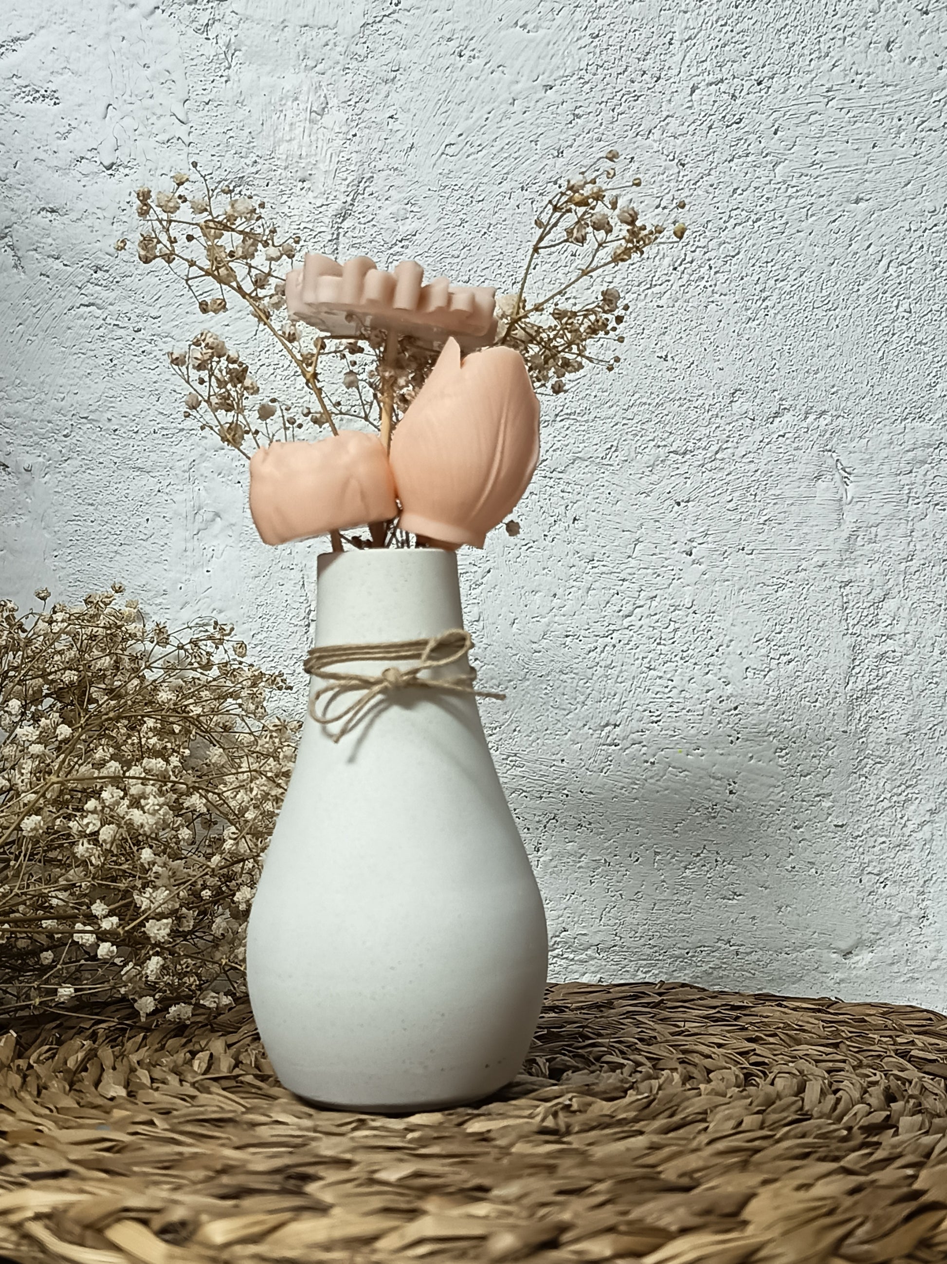 Elaborados con cera de soja 100% natural, estos arreglos de 3 o cuatro flores dependiendo del jarrón no solo son una alternativa ecológica y sostenible, sino también versátil. Puede optar por un arreglo sin fragancia, una pieza de decoración atemporal que mantiene su belleza, o elegir una opción aromática para infundir su hogar con delicadas esencias.